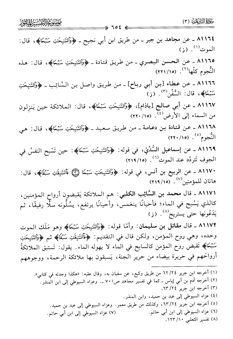٨١١٦٨ - عن قتادة بن دعامة -من طريق سعيد- {والسّابِحاتِ سَبْحًا}، قال: هي النُّجوم (¬٥). (١٥/ ٢٢٠)