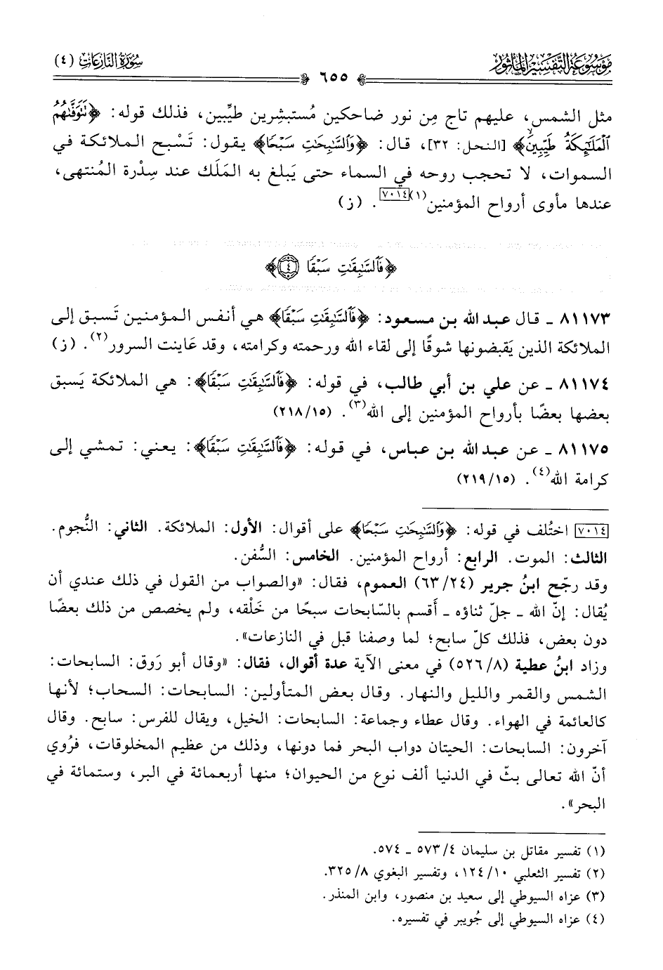 [٧٠١٤] اختُلف في قوله: {والسابحات سبحا} على أقوال: الأول: الملائكة. الثاني: النُّجوم. الثالث: الموت. الرابع: أرواح المؤمنين. الخامس: السُّفن.