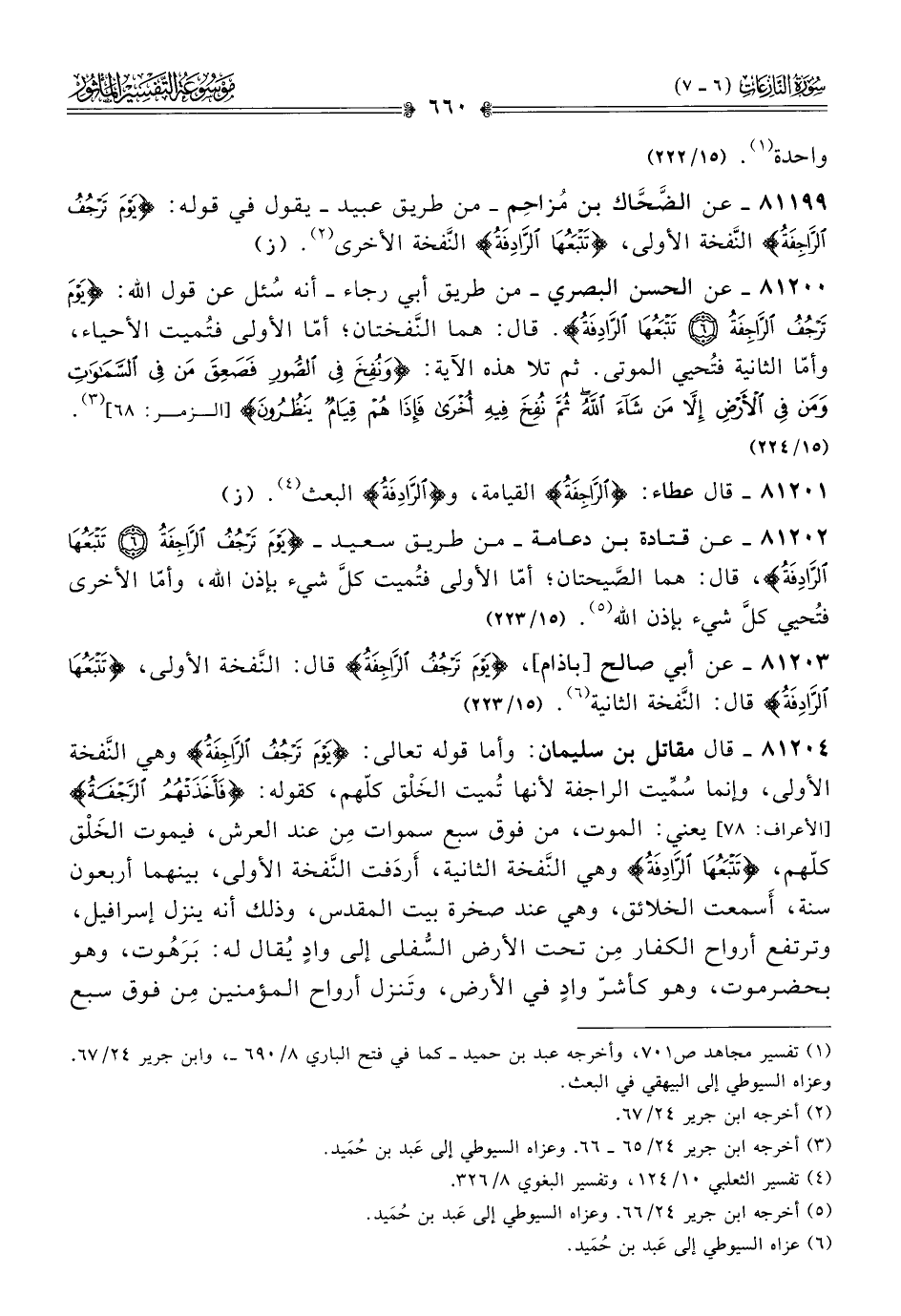 ٨١٢٠٢ - عن قتادة بن دعامة -من طريق سعيد- {يَوْمَ تَرْجُفُ الرّاجِفَةُ تَتْبَعُها الرّادِفَةُ}، قال: هما الصَّيحتان؛ أمّا الأولى فتُميت كلَّ شيء بإذن الله، وأمّا الأخرى فتُحيي كلَّ شيء بإذن الله (¬٥). (١٥/ ٢٢٣)