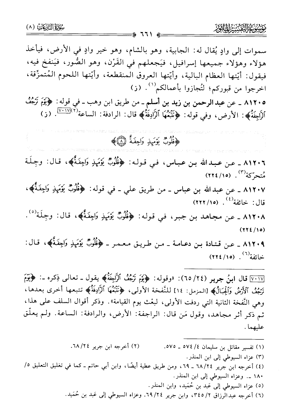 [٧٠١٧] قال ابنُ جرير (٢٤/ ٦٥): «وقوله: {يوم ترجف الراجفة} يقول -تعالى ذِكره-: {يوم ترجف الأرض والجبال} [المزمل: ١٤] للنَّفخة الأولى، {تتبعها الرادفة} تتبعها أخرى بعدها، وهي النَّفخة الثانية التي ردفت الأولى، لبعْث يوم القيامة». وذكر أقوال السلف على هذا، ثم ذكر أثر مجاهد، وقول مَن قال: الراجفة: الأرض، والرادفة: الساعة. ولم يعلّق عليهما.