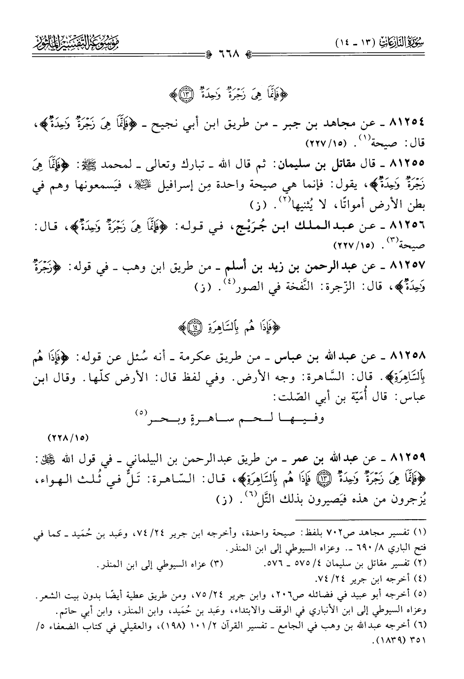 ٨١٢٥٨ - عن عبد الله بن عباس -من طريق عكرمة- أنه سُئل عن قوله: {فَإذا هُمْ بِالسّاهِرَةِ}. قال: السّاهرة: وجه الأرض. وفي لفظ قال: الأرض كلّها. وقال ابن عباس: قال أُمَيّة بن أبي الصّلت: