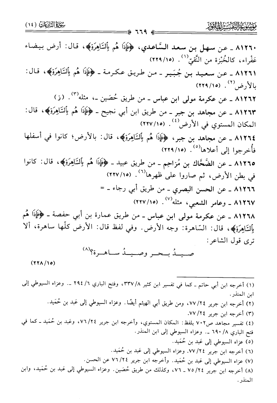 ٨١٢٦٨ - عن عكرمة مولى ابن عباس -من طريق عمارة بن أبي حفصة- {فَإذا هُمْ بِالسّاهِرَةِ}، قال: السّاهرة: وجه الأرض. وفي لفظ قال: الأرض كلّها ساهرة، ألا ترى قول الشاعر: