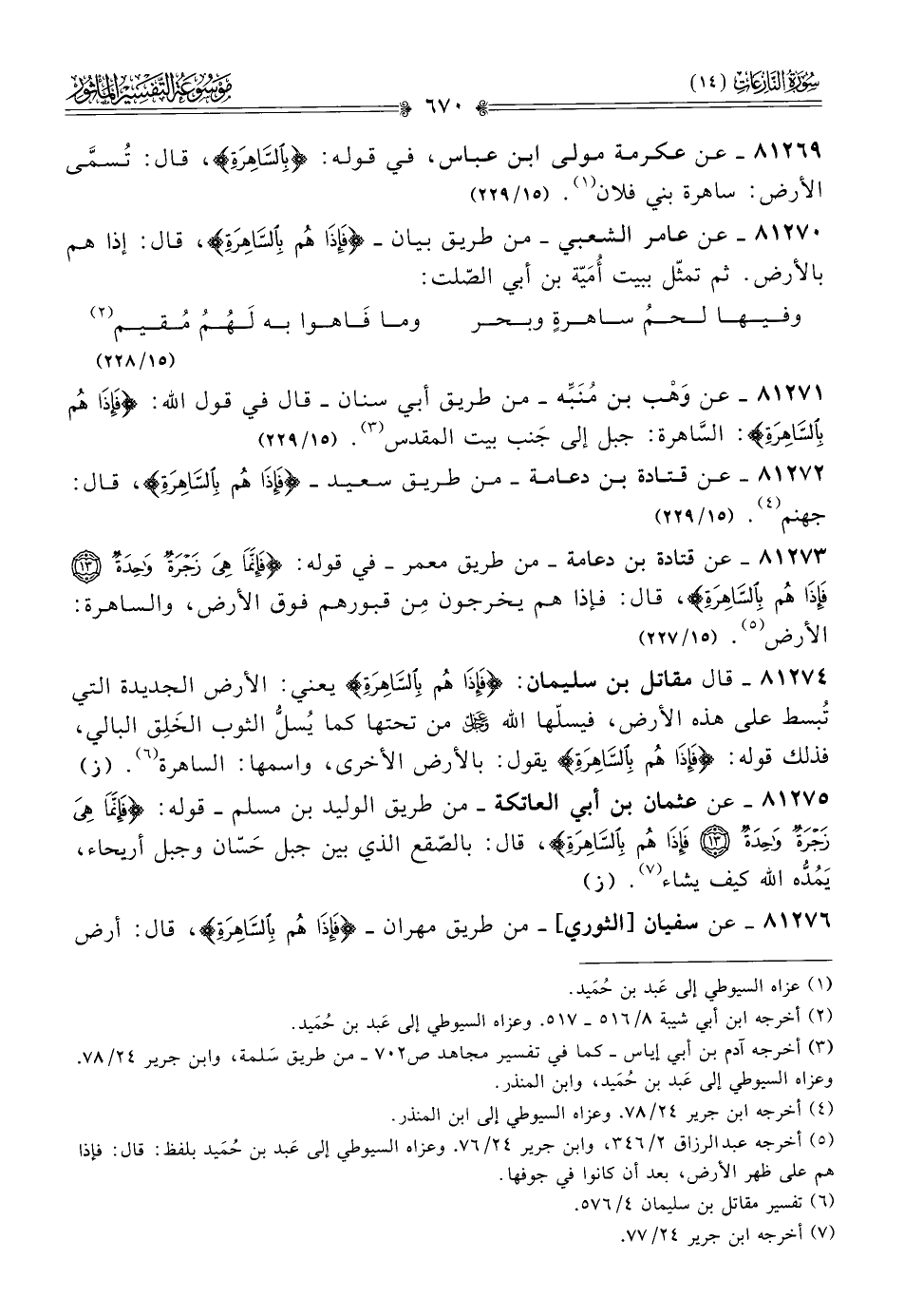 ٨١٢٧٢ - عن قتادة بن دعامة -من طريق سعيد- {فَإذا هُمْ بِالسّاهِرَةِ}، قال: جهنم (¬٤). (١٥/ ٢٢٩)