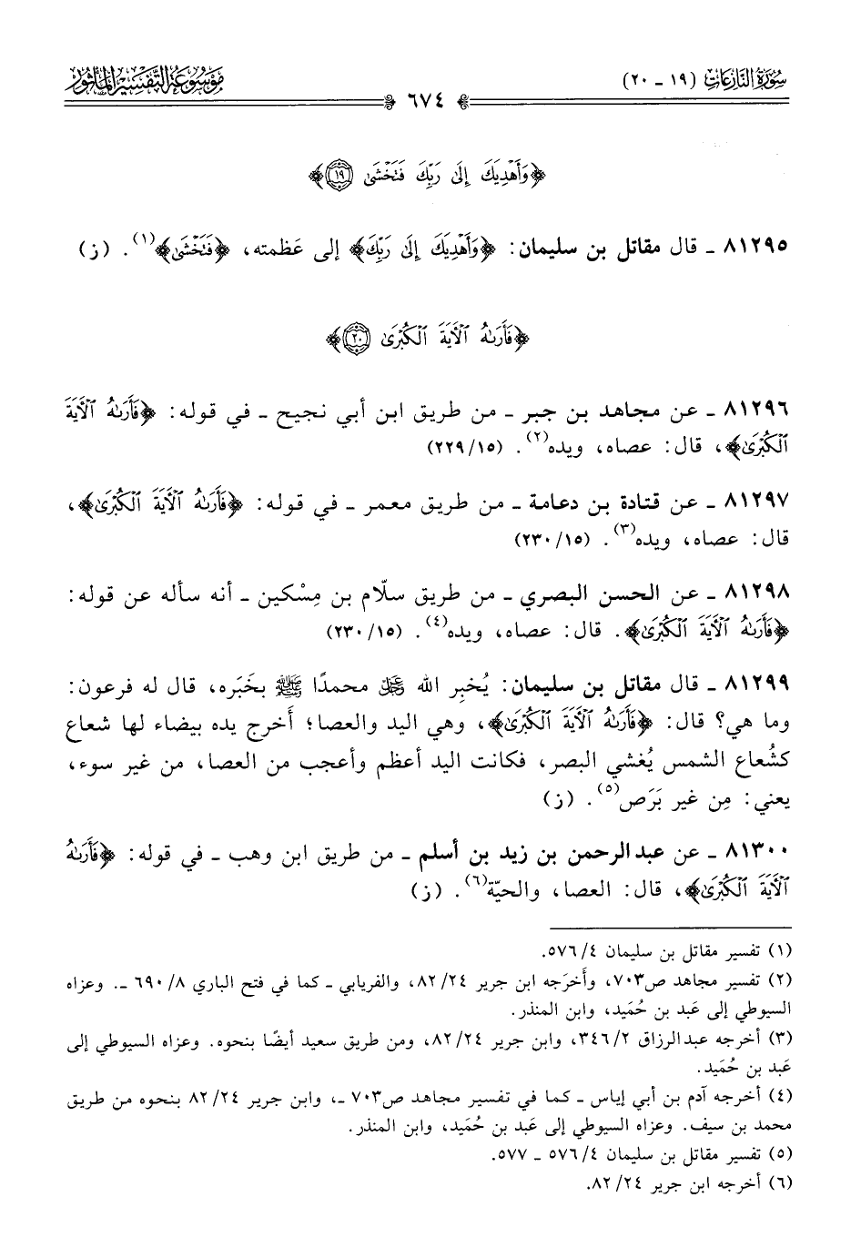 ٨١٢٩٦ - عن مجاهد بن جبر -من طريق ابن أبي نجيح- في قوله: {فَأَراهُ الآيَةَ الكُبْرى}، قال: عصاه، ويده (¬٢). (١٥/ ٢٢٩)