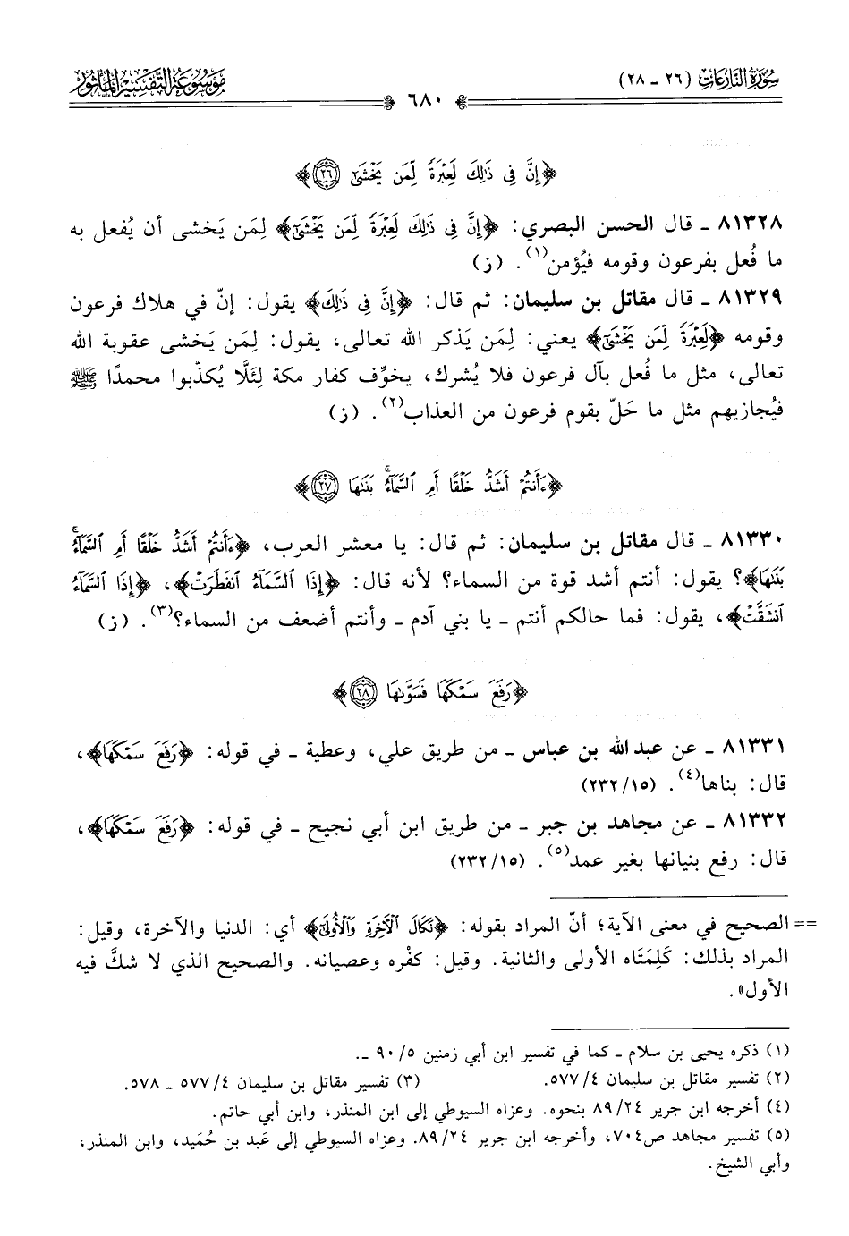٨١٣٣٢ - عن مجاهد بن جبر -من طريق ابن أبي نجيح- في قوله: {رَفَعَ سَمْكَها}، قال: رفع بنيانها بغير عمد (¬٥). (١٥/ ٢٣٢)