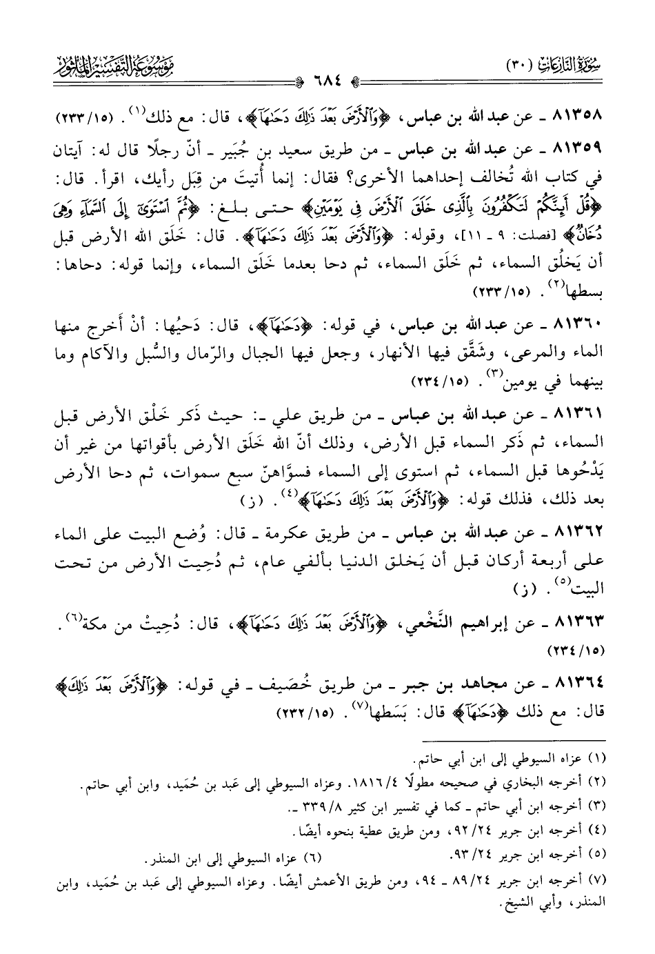 ٨١٣٦٠ - عن عبد الله بن عباس، في قوله: {دَحاها}، قال: دَحيُها: أنْ أخرج منها الماء والمرعى، وشَقَّق فيها الأنهار، وجعل فيها الجبال والرّمال والسُّبل والآكام وما بينهما في يومين (¬٣). (١٥/ ٢٣٤)