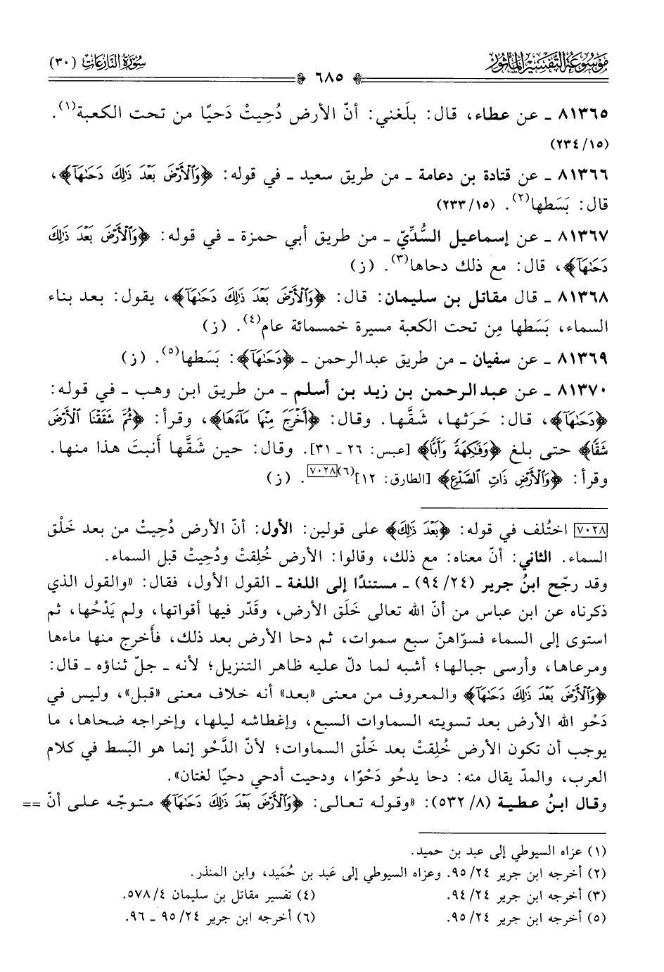 ٨١٣٦٦ - عن قتادة بن دعامة -من طريق سعيد- في قوله: {والأَرْضَ بَعْدَ ذَلِكَ دَحاها}، قال: بَسَطها (¬٢). (١٥/ ٢٣٣)