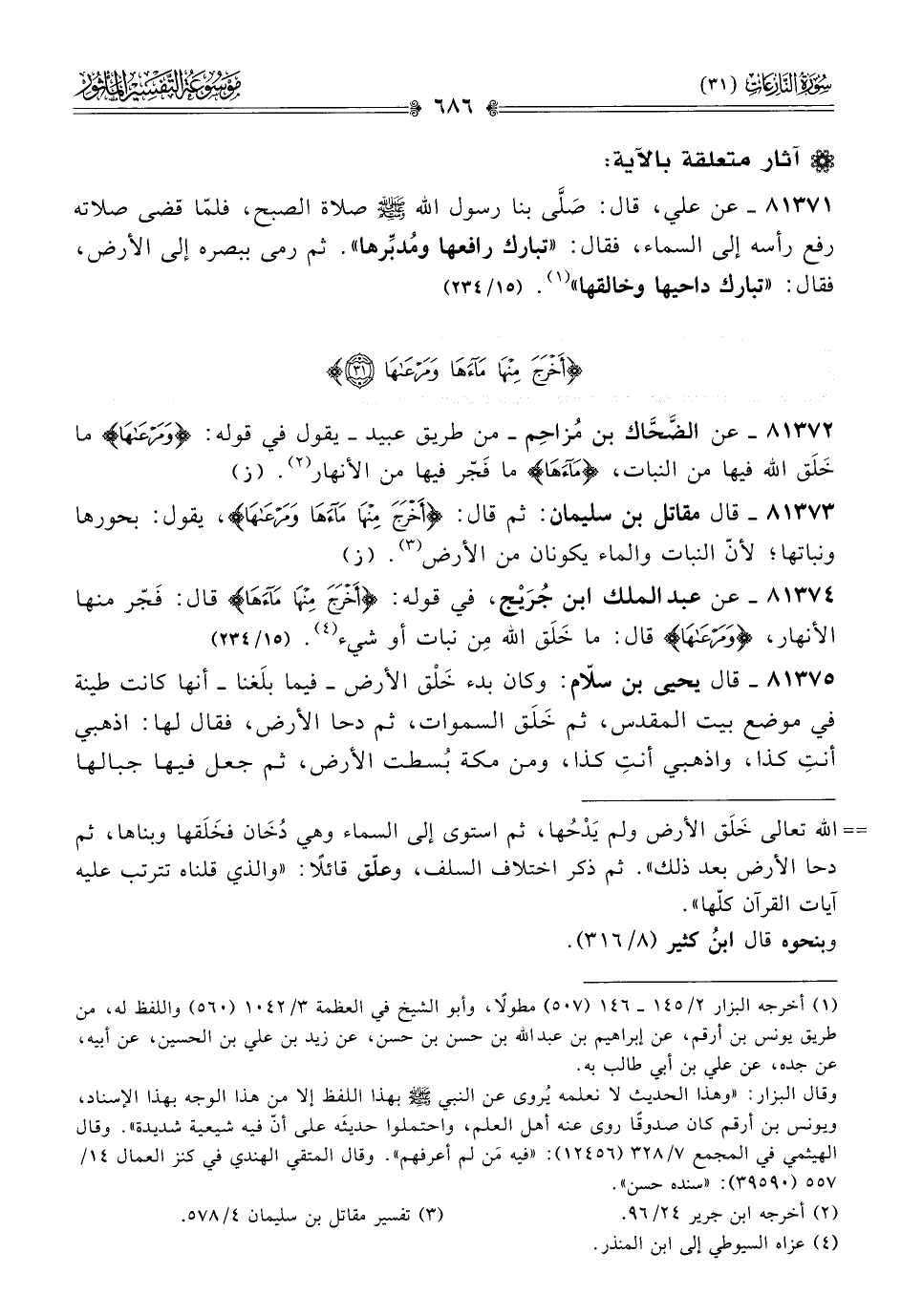 ٨١٣٧٣ - قال مقاتل بن سليمان: ثم قال: {أخْرَجَ مِنها ماءَها ومَرْعاها}، يقول: بحورها ونباتها؛ لأنّ النبات والماء يكونان من الأرض (¬٣). (ز)