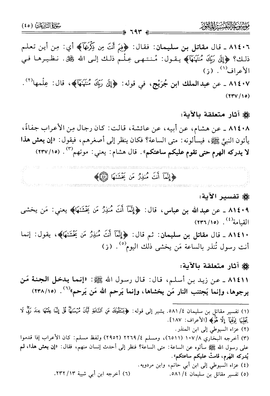 ٨١٤١٠ - قال مقاتل بن سليمان: ثم قال: {إنَّما أنْتَ مُنْذِرُ مَن يَخْشاها}، يقول: إنما أنت رسول تُنذر بالساعة مَن يخشى ذلك اليوم (¬٥). (ز)
