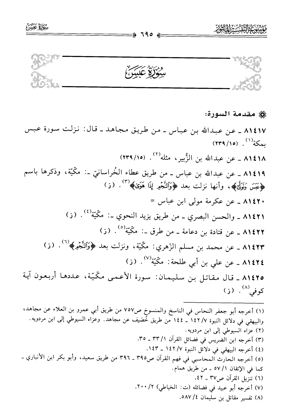 ٨١٤٢٥ - قال مقاتل بن سليمان: سورة الأعمى مكّيّة، عددها أربعون آية كوفي (¬٨). (ز)
