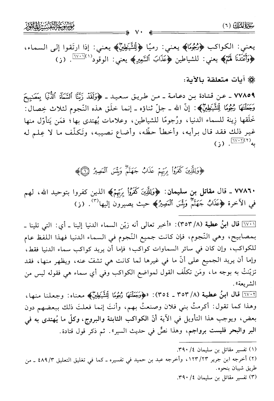 [٦٧٠٢] قال ابنُ عطية (٨/ ٣٥٣ - ٣٥٤): «{وجَعَلْناها رُجُومًا لِلشَّياطِينِ} معناه: وجعلنا منها، وهذا كما تقول: أكرمتُ بني فلان وصنعتُ بهم، وأنتَ إنما فعلتَ ذلك ببعضهم دون بعض، ويوجب هذا التأويل في الآية أنّ الكواكب الثابتة والبروج، وكلّ ما يُهتدى به في البر والبحر فليست برواجم، وهذا نصٌ في حديث السير». ثم ذكر قول قتادة.