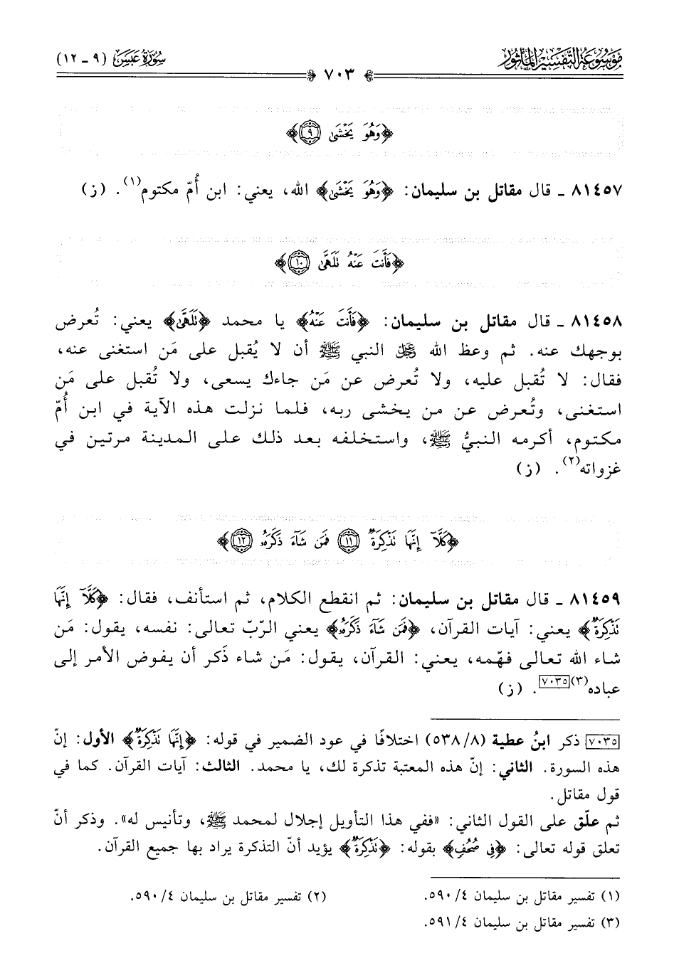 ٨١٤٥٨ - قال مقاتل بن سليمان: {فَأَنْتَ عَنْهُ} يا محمد {تَلَهّى} يعني: تُعرض بوجهك عنه. ثم وعظ الله - عز وجل - النبي - صلى الله عليه وسلم - أن لا يُقبل على مَن استغنى عنه، فقال: لا تُقبل عليه، ولا تُعرض عن مَن جاءك يسعى، ولا تُقبل على مَن استغنى، وتُعرض عن من يخشى ربه، فلما نزلت هذه الآية في ابن أُمّ مكتوم، أكرمه النبيُّ - صلى الله عليه وسلم -، واستخلفه بعد ذلك على المدينة مرتين في غزواته (¬٢). (ز)