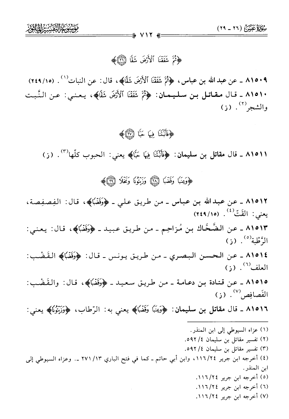 ٨١٥١٠ - قال مقاتل بن سليمان: {ثُمَّ شَقَقْنا الأَرْضَ شَقًّا}، يعني: عن النَّبت والشجر (¬٢). (ز)