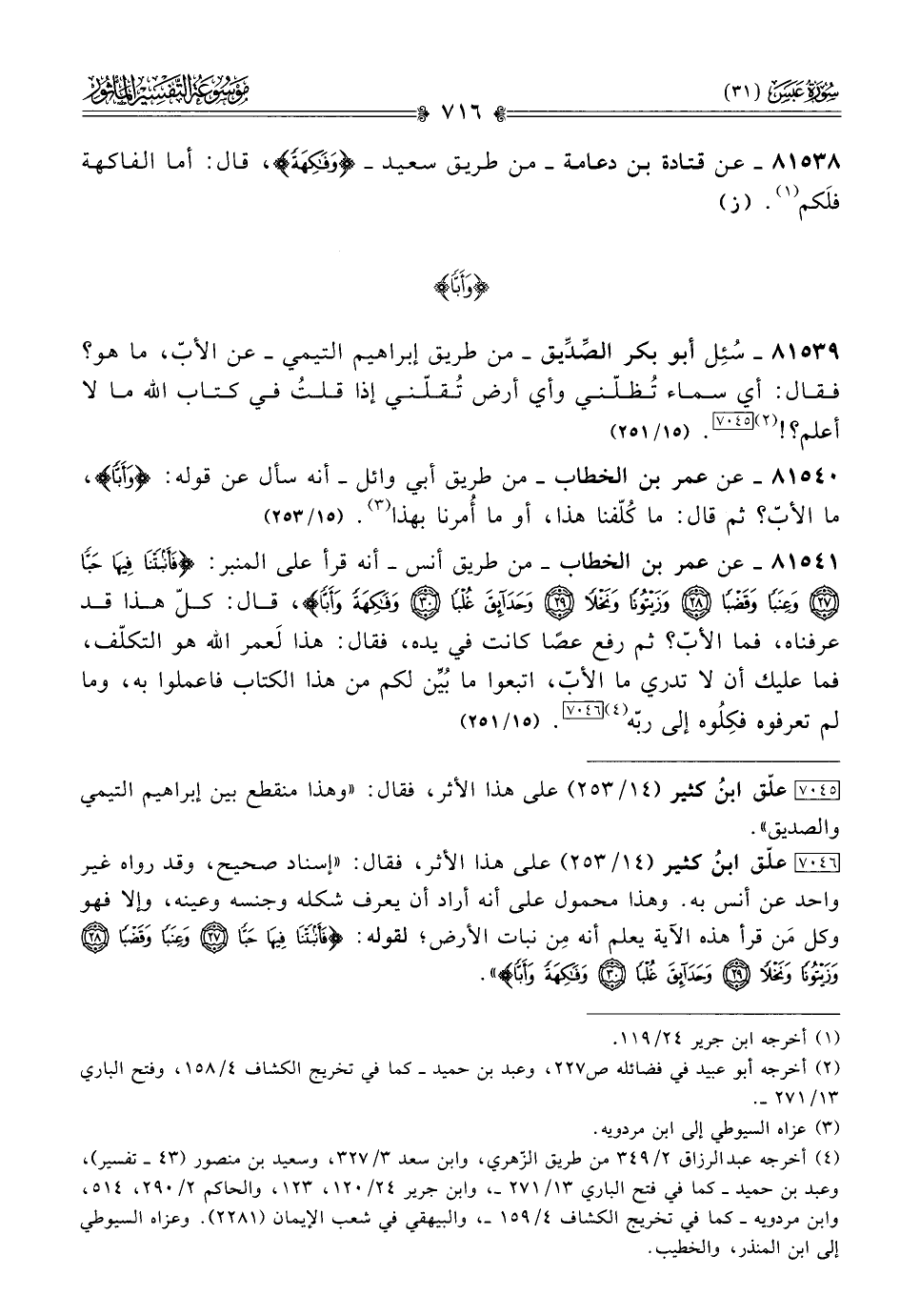 ٨١٥٤٠ - عن عمر بن الخطاب -من طريق أبي وائل- أنه سأل عن قوله: {وأَبًّا}، ما الأبّ؟ ثم قال: ما كُلّفنا هذا، أو ما أُمرنا بهذا (¬٣). (١٥/ ٢٥٣)
