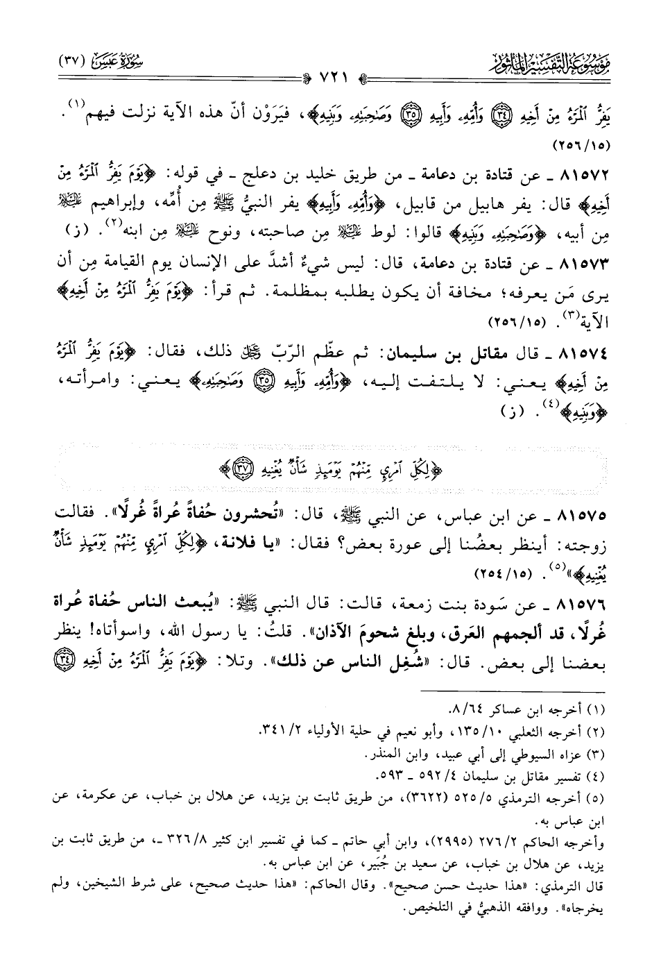 ٨١٥٧٥ - عن ابن عباس، عن النبي - صلى الله عليه وسلم -، قال: «تُحشرون حُفاةً عُراةً غُرلًا». فقالت زوجته: أينظر بعضُنا إلى عورة بعض؟ فقال: «يا فلانة، {لِكُلِّ امْرِئٍ مِنهُمْ يَوْمَئِذٍ شَأْنٌ يُغْنِيهِ}» (¬٥). (١٥/ ٢٥٤)