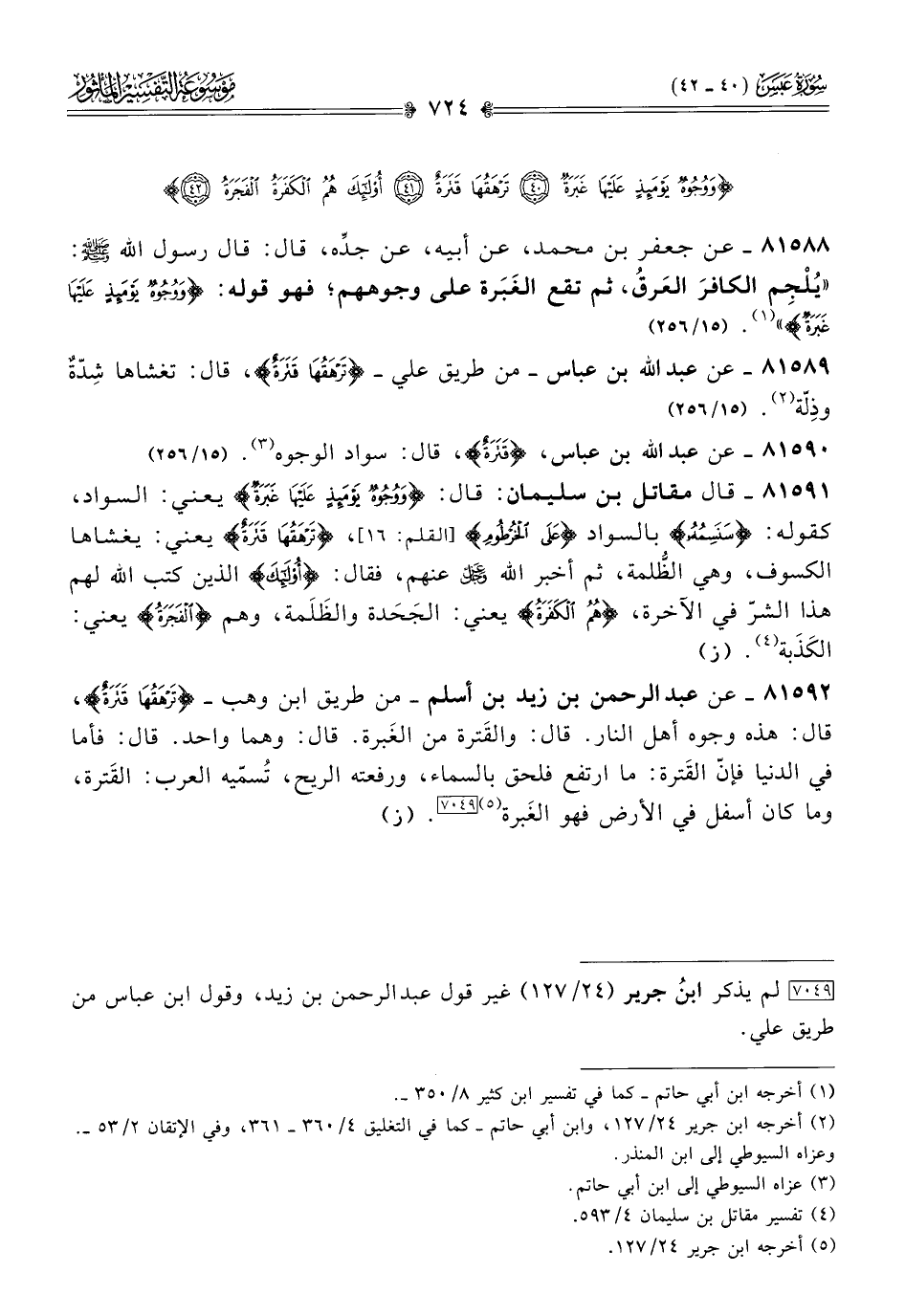 ٨١٥٨٩ - عن عبد الله بن عباس -من طريق علي- {تَرْهَقُها قَتَرَةٌ}، قال: تغشاها شِدّةٌ وذِلّة (¬٢). (١٥/ ٢٥٦)