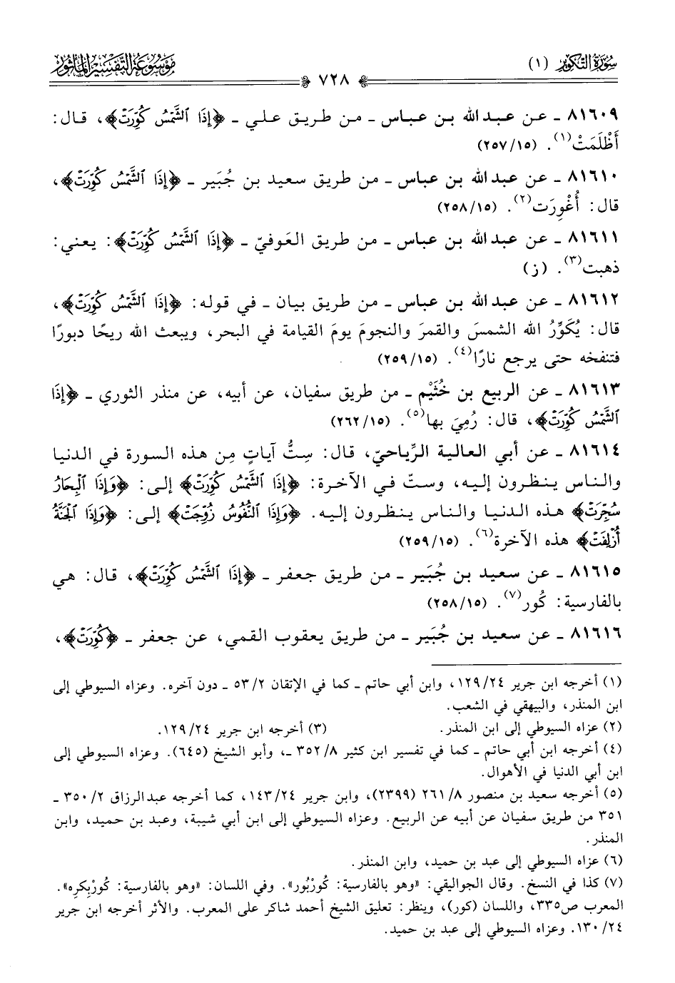 ٨١٦١٠ - عن عبد الله بن عباس -من طريق سعيد بن جُبَير- {إذا الشَّمْسُ كُوِّرَتْ}، قال: أُغْوِرَت (¬٢). (١٥/ ٢٥٨)