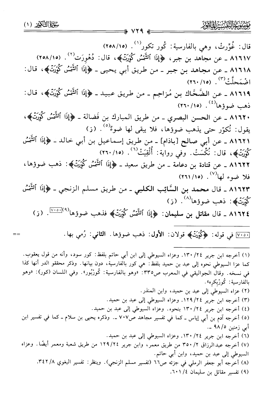 ٨١٦٢٤ - قال مقاتل بن سليمان: {إذا الشَّمْسُ كُوِّرَتْ} فذهب ضوؤها (¬٩) [٧٠٥٠]. (ز)