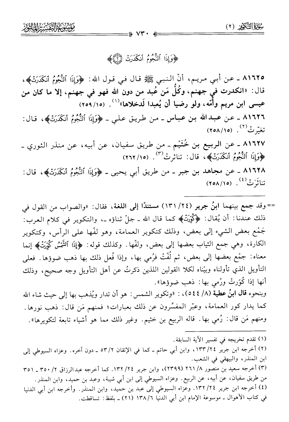 ٨١٦٢٥ - عن أبي مريم، أنّ النبي - صلى الله عليه وسلم - قال في قول الله: {وإذا النُّجُومُ انْكَدَرَتْ}، قال: «انكدرت في جهنم، وكُلُّ مَن عُبد من دون الله فهو في جهنم، إلا ما كان من عيسى ابن مريم وأُمّه، ولو رضيا أن يُعبدا لَدخلاها» (¬١). (١٥/ ٢٥٩)