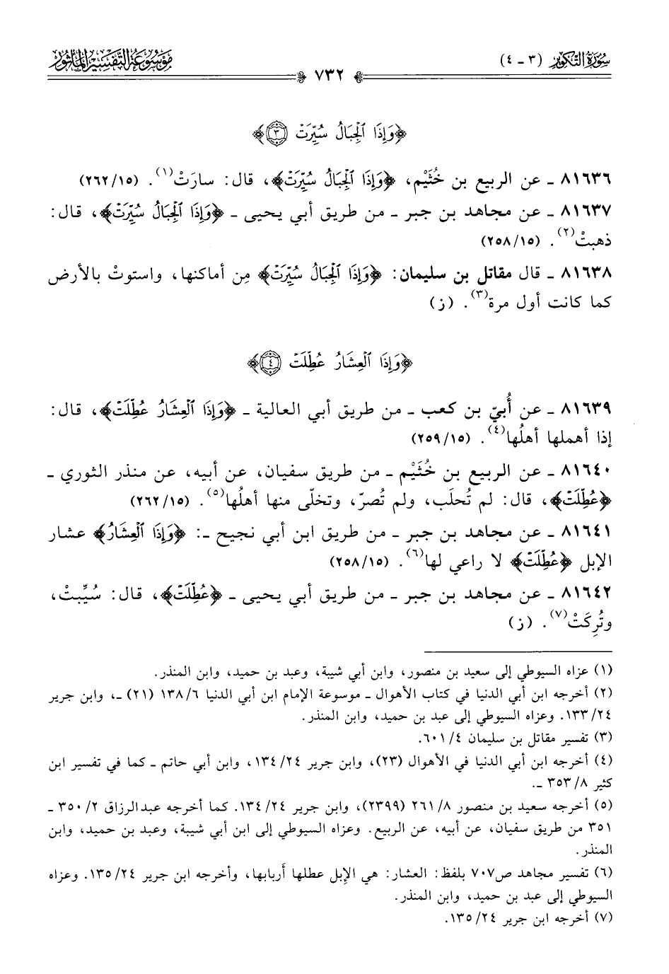 ٨١٦٤١ - عن مجاهد بن جبر -من طريق ابن أبي نجيح-: {وإذا العِشارُ} عشار الإبل {عُطِّلَتْ} لا راعي لها (¬٦). (١٥/ ٢٥٨)