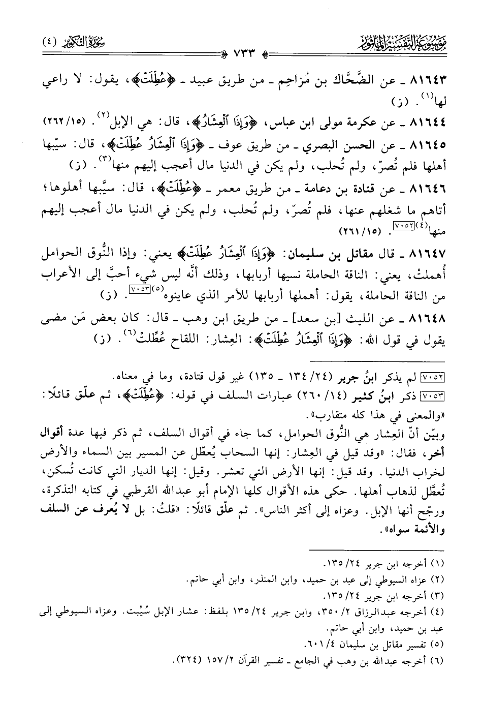 ٨١٦٤٤ - عن عكرمة مولى ابن عباس، {وإذا العِشارُ}، قال: هي الإبل (¬٢). (١٥/ ٢٦٢)