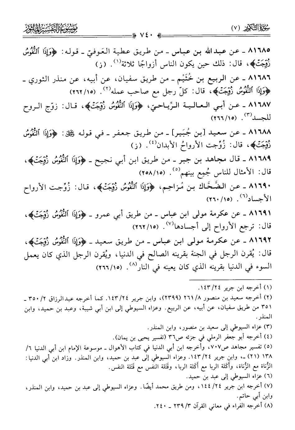 ٨١٦٩٠ - عن الضَّحّاك بن مُزاحِم، {وإذا النُّفُوسُ زُوِّجَتْ}، قال: زُوِّجت الأرواح الأجساد (¬٦). (١٥/ ٢٦٠)