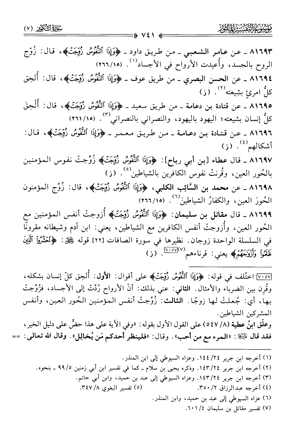 ٨١٦٩٧ - قال عطاء [بن أبي رباح]: {وإذا النُّفُوسُ زُوِّجَتْ} زُوِّجتْ نفوس المؤمنين بالحُور العين، وقُرنتْ نفوس الكافرين بالشياطين (¬٥). (ز)