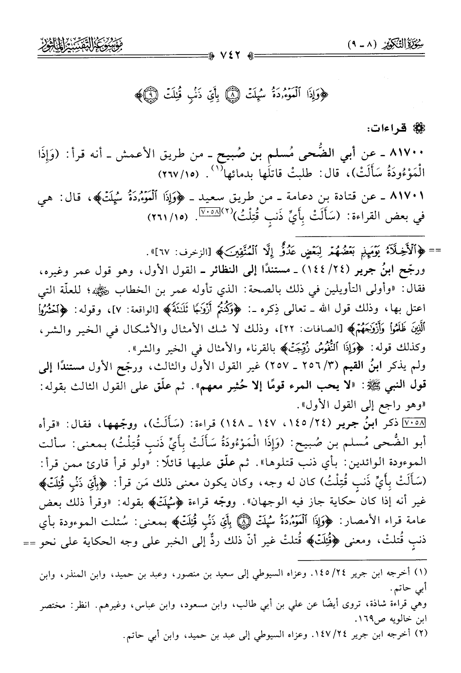 ٨١٧٠١ - عن قتادة بن دعامة -من طريق سعيد- {وإذا المَوْءُودَةُ سُئِلَتْ}، قال: هي في بعض القراءة: (سَأَلَتْ بِأَيِّ ذَنبٍ قُتِلْتُ) (¬٢) [٧٠٥٨]. (١٥/ ٢٦١)
