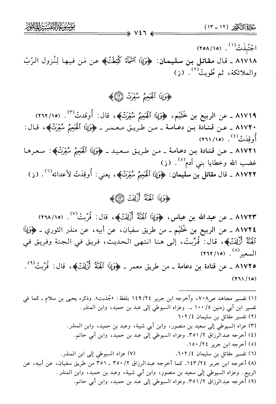٨١٧٢٤ - عن الربيع بن خُثَيْم -من طريق سفيان، عن أبيه، عن منذر الثوري- {وإذا الجَنَّةُ أُزْلِفَتْ}، قال: قُرِّبتْ، إلى هنا انتهى الحديث، فريق في الجنة وفريق في السعير (¬٨). (١٥/ ٢٦٢)