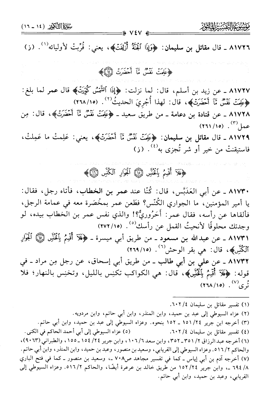 ٨١٧٣١ - عن عبد الله بن مسعود -من طريق أبي ميسرة- {فَلا أُقْسِمُ بِالخُنَّسِ الجَوارِ الكُنَّسِ}، قال: هي بقر الوحش (¬٦). (١٥/ ٢٦٩)