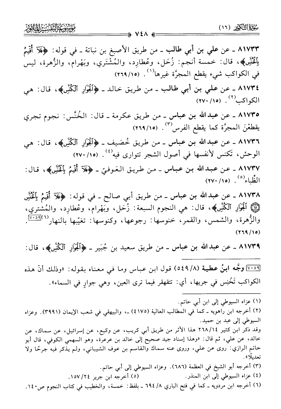 ٨١٧٣٥ - عن عبد الله بن عباس -من طريق عكرمة- قال: الخُنَّس: نجوم تجري يقطعْنَ المجرَّة كما يقطع الفرس (¬٣). (١٥/ ٢٦٩)