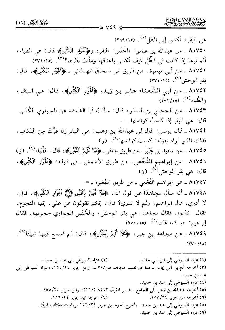 ٨١٧٤٩ - عن مجاهد بن جبر، {فَلا أُقْسِمُ بِالخُنَّسِ}، قال: لم أسمع فيها شيئًا (¬٩). (١٥/ ٢٧٠)