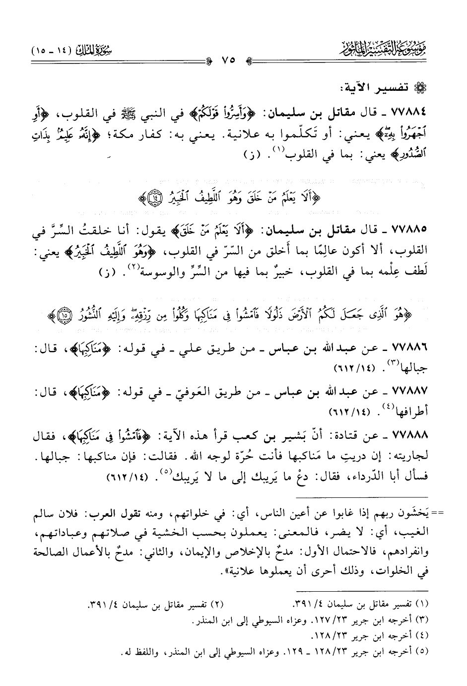 ٧٧٨٨٦ - عن عبد الله بن عباس -من طريق علي- في قوله: {مَناكِبِها}، قال: جبالها (¬٣). (١٤/ ٦١٢)