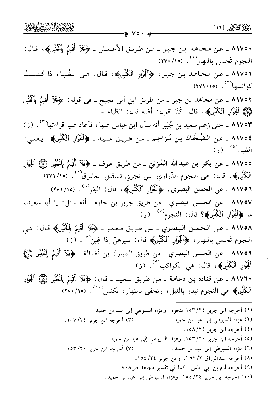 ٨١٧٥٠ - عن مجاهد بن جبر -من طريق الأعمش- {فَلا أُقْسِمُ بِالخُنَّسِ}، قال: النجوم تَخنس بالنهار (¬١). (١٥/ ٢٧٠)
