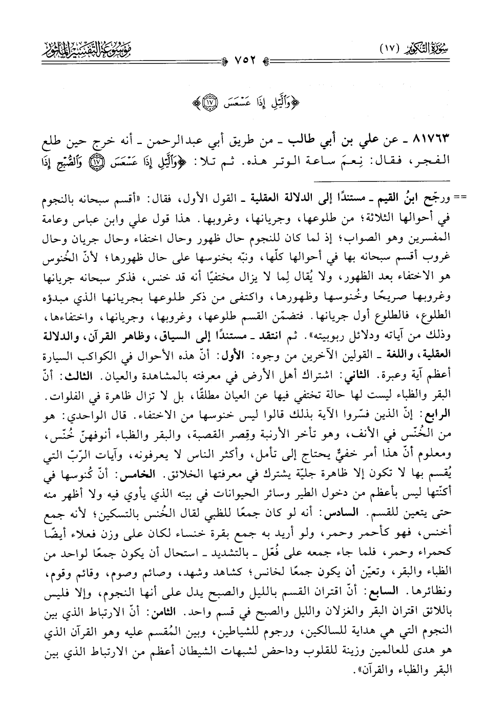 ٨١٧٦٣ - عن علي بن أبي طالب -من طريق أبي عبد الرحمن- أنه خرج حين طلع الفجر، فقال: نِعمَ ساعة الوتر هذه. ثم تلا: {واللَّيْلِ إذا عَسْعَسَ والصُّبْحِ إذا