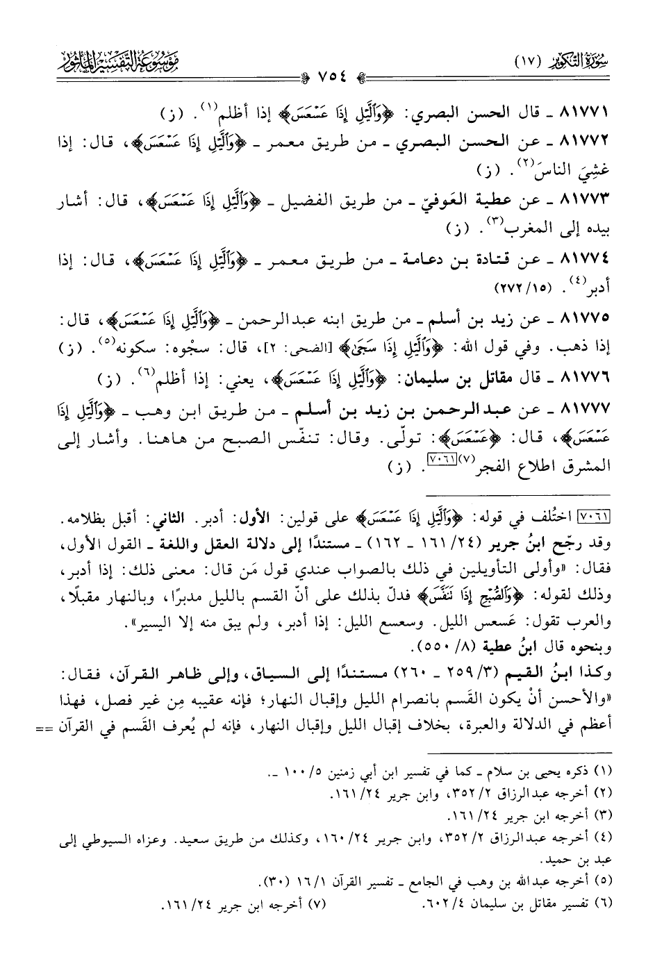 وكذا ابنُ القيم (٣/ ٢٥٩ - ٢٦٠) مستندًا إلى السياق، وإلى ظاهر القرآن، فقال: «والأحسن أنْ يكون القَسم بانصرام الليل وإقبال النهار؛ فإنه عقيبه مِن غير فصل، فهذا أعظم في الدلالة والعبرة، بخلاف إقبال الليل وإقبال النهار، فإنه لم يُعرف القَسم في القرآن بهما، ولأنّ بينهما زمنًا طويلًا، فالآية في انصرام هذا ومجيء الآخر عقيبه بغير فصل أبلغ، فذكر سبحانه حالة ضعف هذا وإدباره، وحالة قوة هذا وتنفّسه، وإقباله يطرد ظلمة الليل بتنفّسه، فكلما تنفّس هرب الليل وأدبر بين يديه، وهذا هو القول».