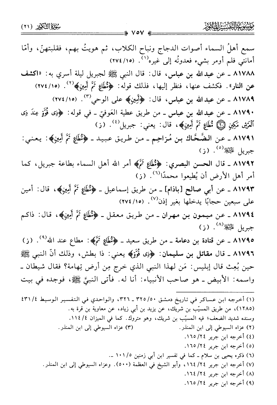 ٨١٧٨٨ - عن عبد الله بن عباس، قال: قال النبي - صلى الله عليه وسلم - لجبريل ليلة أسري به: «اكشف عن النار». فكشف عنها، فنظر إليها، فذلك قوله: {مُطاعٍ ثَمَّ أمِينٍ} (¬٢). (١٥/ ٢٧٤)