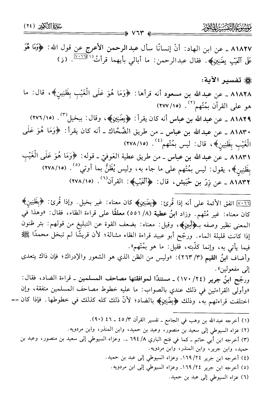 ٨١٨٢٨ - عن عبد الله بن مسعود أنه قرأها: «وما هُوَ عَلى الغَيْبِ بِظَنِينٍ»، قال: ما هو على القرآن بمُتّهم (¬٢). (١٥/ ٢٧٧)