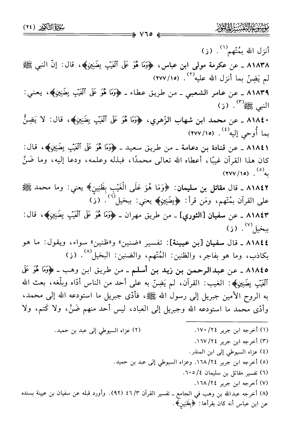 ٨١٨٣٩ - عن عامر الشعبي -من طريق عطاء- {وما هُوَ عَلى الغَيْبِ بِضَنِينٍ}، يعني: النبي - صلى الله عليه وسلم - (¬٣).
