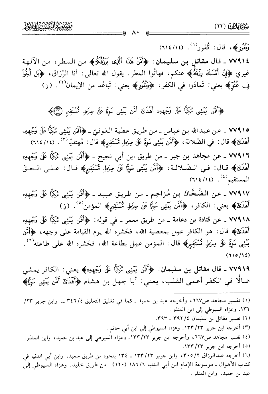 ٧٧٩١٩ - قال مقاتل بن سليمان: {أفَمَن يَمْشِي مُكِبًّا عَلى وجْهِهِ} يعني: الكافر يمشي ضالًّا في الكفر أعمى القلب، يعني: أبا جهل بن هشام {أهْدى أمَّنْ يَمْشِي سَوِيًّا}