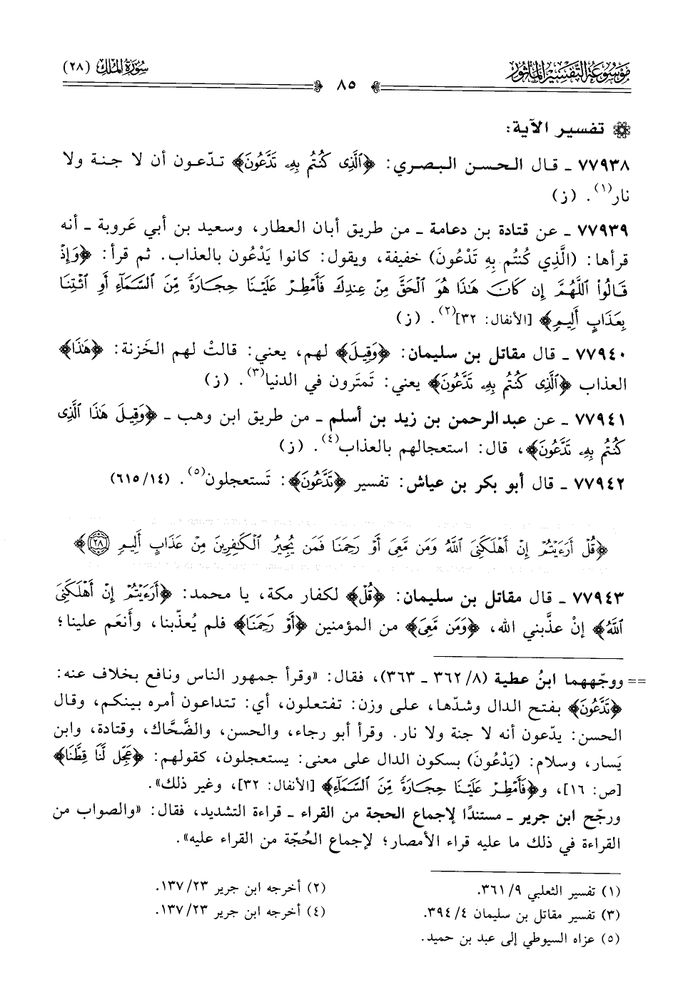 ٧٧٩٣٩ - عن قتادة بن دعامة -من طريق أبان العطار، وسعيد بن أبي عَروبة- أنه قرأها: (الَّذِي كُنتُم بِهِ تَدْعُونَ) خفيفة، ويقول: كانوا يَدْعُون بالعذاب. ثم قرأ: {وإذ قالوا اللهم إن كان هذا هو الحق من عندك فأمطر علينا حجارة من السماء أو ائتنا بعذاب أليم} [الأنفال: ٣٢] (¬٢). (ز)