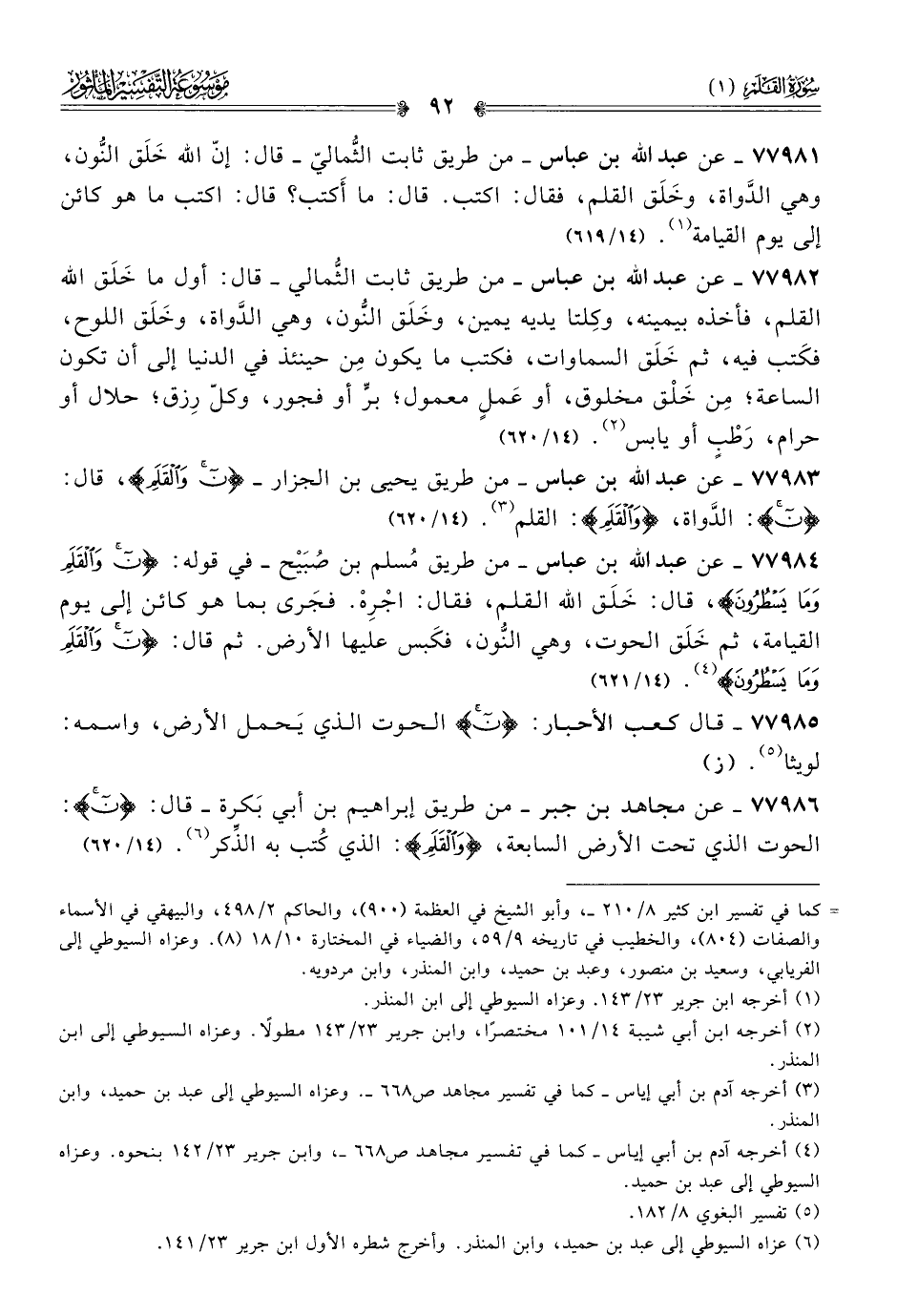 ٧٧٩٨٤ - عن عبد الله بن عباس -من طريق مُسلم بن صُبَيْح- في قوله: {ن والقَلَمِ وما يَسْطُرُونَ}، قال: خَلَق الله القلم، فقال: اجْرِهْ. فجَرى بما هو كائن إلى يوم القيامة، ثم خَلَق الحوت، وهي النُّون، فكَبس عليها الأرض. ثم قال: {ن والقَلَمِ وما يَسْطُرُونَ} (¬٤). (١٤/ ٦٢١)