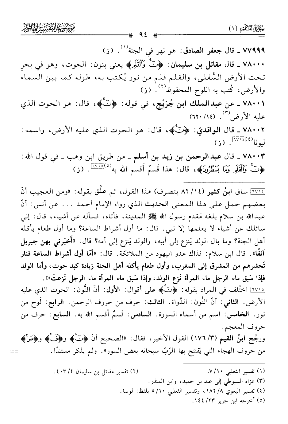 ٧٨٠٠٠ - قال مقاتل بن سليمان: {ن والقَلَمِ} يعني بنون: الحوت، وهو في بحرٍ تحت الأرض السُّفلى، والقلم قلم من نور يُكتب به، طوله كما بين السماء والأرض، كُتب به اللوح المحفوظ (¬٢). (ز)
