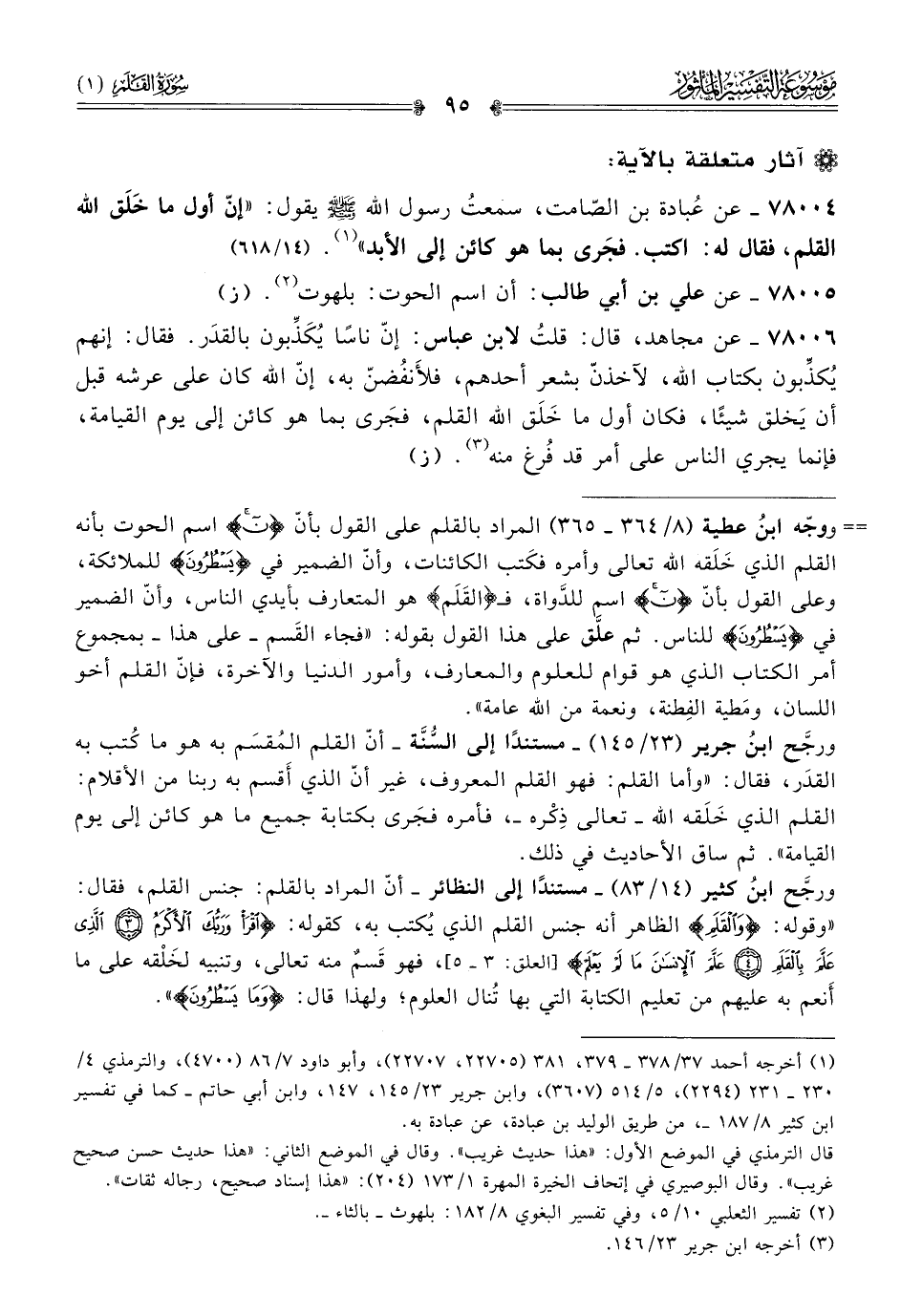 ٧٨٠٠٤ - عن عُبادة بن الصّامت، سمعتُ رسول الله - صلى الله عليه وسلم - يقول: «إنّ أول ما خَلَق الله القلم، فقال له: اكتب. فجَرى بما هو كائن إلى الأبد» (¬١). (١٤/ ٦١٨)