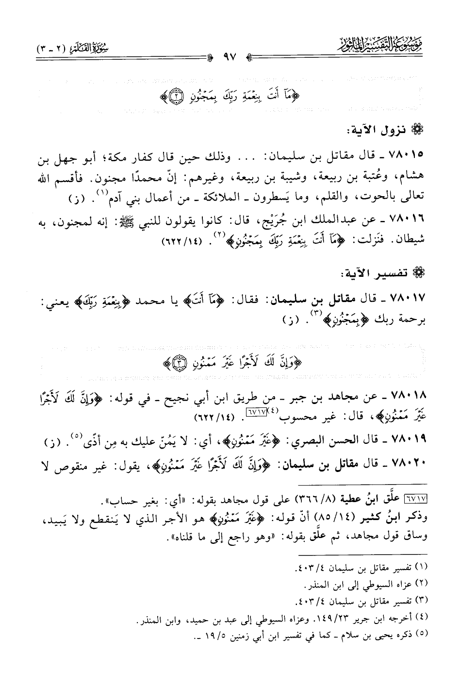 ٧٨٠٢٠ - قال مقاتل بن سليمان: {وإنَّ لَكَ لَأَجْرًا غَيْرَ مَمْنُونٍ}، يقول: غير منقوص لا