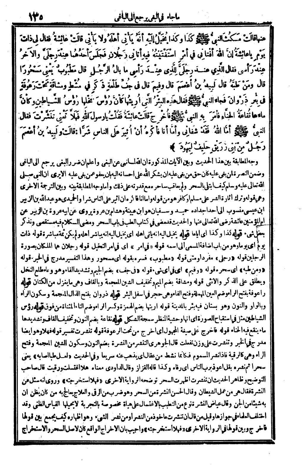 عَنْهَا، قالَتْ: مَكُثَ النبيُّ صلى الله عَلَيْهِ وَسلم كَذَا وَكَذا يُخَيَّلُ إلَيْهِ أنَّهُ يَأتِي أهْلَهُ وَلَا يَأْتِي، قالَتْ عائِشةُ، قالَتْ عائِشَةُ: فَقَالَ لِي ذاتَ يَوْمٍ: يَا عائِشَةُ {إنَّ الله أفْتانِي فِي أمْرٍ اسْتَفْتَيْتُهُ فِيهِ، أتانِي رَجُلانِ فَجَلَسَ أحَدُهُما عِنْدَ رِجْلَيَّ والآخرُ عِنْدَ رَأسي، فَقَالَ الَّذِي عندَ رِجْلَيَّ لِلَّذِي عِنْدَ رَأسِي: مَا بالُ الرَّجُلِ؟ قَالَ: مَطْبُوبٌ، يَعْنِي مَسْحُوراً. قَالَ: وَمَنْ طَبَّهُ؟ قَالَ: لَبِيدُ بنُ أعْصَمَ. قَالَ: وفِيمَ؟ قَالَ: فِي جُفِّ طَلْعَةٍ ذَكَرٍ فِي مُشْطٍ ومُشَاقَةٍ تَحْتَ رَعُوفَةٍ فِي بِئرِ ذَرْوانَ، فَجاءَ النبيُّ صلى الله عَلَيْهِ وَسلم فأُخْرِجَ. قالَتْ عائِشَةُ: فَقُلْتُ: يَا رسولَ الله} فَهَلاَّ تَعْنِي: تَنَشَّرْتَ؟ فَقَالَ النبيُّ صلى الله عَلَيْهِ وَسلم: أمَّا الله فَقَدْ شَفانِي، وأمَّا أَنا فأكْرَهُ أنْ أُثِيرَ عَلَى الناسِ شَرًّا. قالَتْ: ولَبِيدُ بنُ أعْصَمَ رَجُلٌ مِنْ بَنِي زُرَيْقٍ حَلِيفٌ لِيَهُودَ.