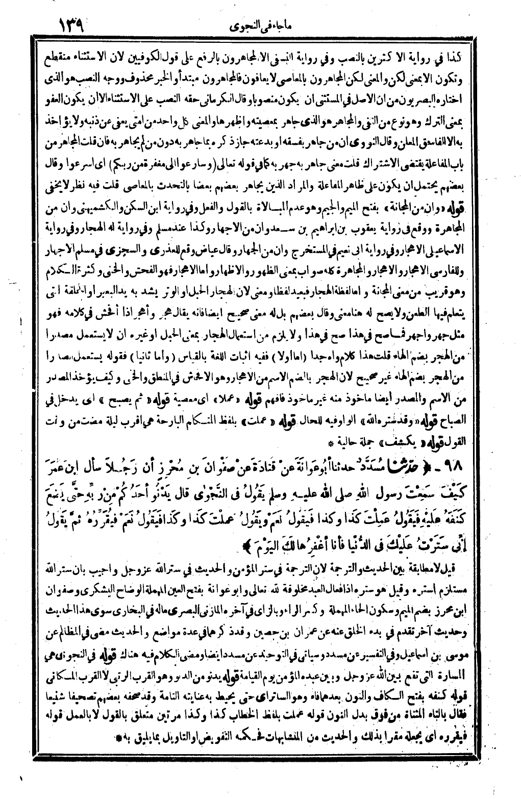 قَوْله: (فِي النَّجْوَى) هِيَ المسارة الَّتِي تقع بَين الله عز وَجل وَبَين عَبده الْمُؤمن يَوْم الْقِيَامَة. قَوْله: (يدنو) من الدنو وَهُوَ الْقرب الربي لَا الْقرب المكاني قَوْله: (كنفه) بِفَتْح الْكَاف وَالنُّون بعدهمَا فَاء وَهُوَ السَّاتِر أَي: حَتَّى يُحِيط بِهِ عنايته التَّامَّة، وَقد صحفه بَعضهم تصحيفاً شنيعاً فَقَالَ: بِالتَّاءِ الْمُثَنَّاة من فَوق بدل النُّون. قَوْله: (عملت) بِلَفْظ الْخطاب كَذَا وَكَذَا، مرَّتَيْنِ مُتَعَلق بالْقَوْل لَا بِالْعَمَلِ. قَوْله: (فيقرره) أَي: يَجعله مقرا بذلك. والْحَدِيث من المتشابهات فَحكمه التَّفْوِيض أَو التَّأْوِيل بِمَا يَلِيق بِهِ.