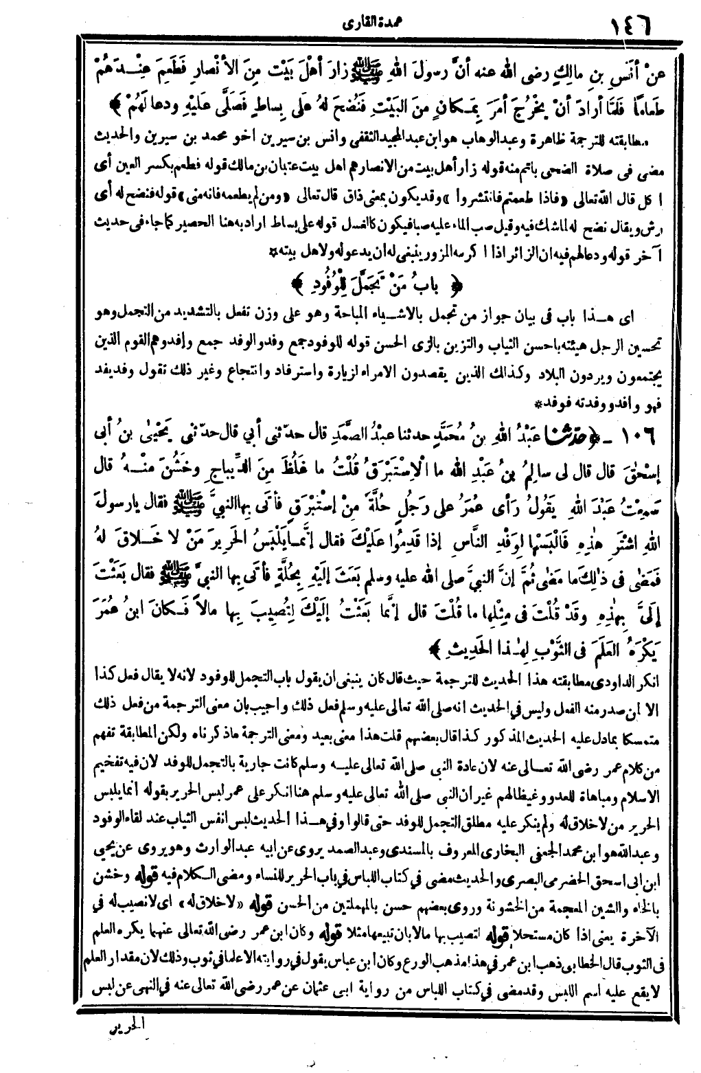6081 - حدَّثنا عَبْدُ الله بنُ مُحَمَّدٍ حَدثنَا عَبْدُ الصَّمَدِ قَالَ: حدّثني أبي قَالَ: حدّثني يَحْياى بنُ أبي إسْحاقَ قَالَ: قَالَ لي سالِمُ بنُ عَبْدِ الله: مَا الإسْتَبْرَقُ؟ قُلْتُ: مَا غَلُظَ مِنَ الدِّيباجِ وخَشُنَ مِنْهُ. قَالَ: سَمِعْتُ عَبْدَ الله يَقُولُ: رَأى عُمَرُ على رَجُلٍ حُلَّة مِنْ اسْتَبْرَق فأتَى بِها النبيَّ صلى الله عَلَيْهِ وَسلم فَقَالَ: يَا رسولَ الله {اشْتَرِي هاذِهِ فَالْبَسْها لِوَفْدِ النَّاسِ إِذا قَدِمُوا عَلَيْكَ، فَقَالَ: إنَّما يَلْبَسُ الحَرِيرَ مَنْ لَا خَلاقَ لَهُ، فَمَضَى فِي ذلكَ مَا مَضاى ثُمَّ إنَّ النبيَّ صلى الله عَلَيْهِ وَسلم، بَعَثَ إلَيْهِ بِحُلَّةٍ فأتَى بِها النبيَّ صلى الله عَلَيْهِ وَسلم، فَقَالَ: بَعَثْتَ إلَيَّ بهذِهِ، وَقَدْ قُلْتَ فِي مِثْلِها مَا قُلْتَ} قَالَ: إنَّما بَعَثْتُ إلَيْكَ لِتُصِيبَ بِها مَالا، فَكانَ ابنُ عُمَرَ يَكْرَهُ العَلَمَ فِي الثَّوْبِ لِهاذا الحَدِيثِ.