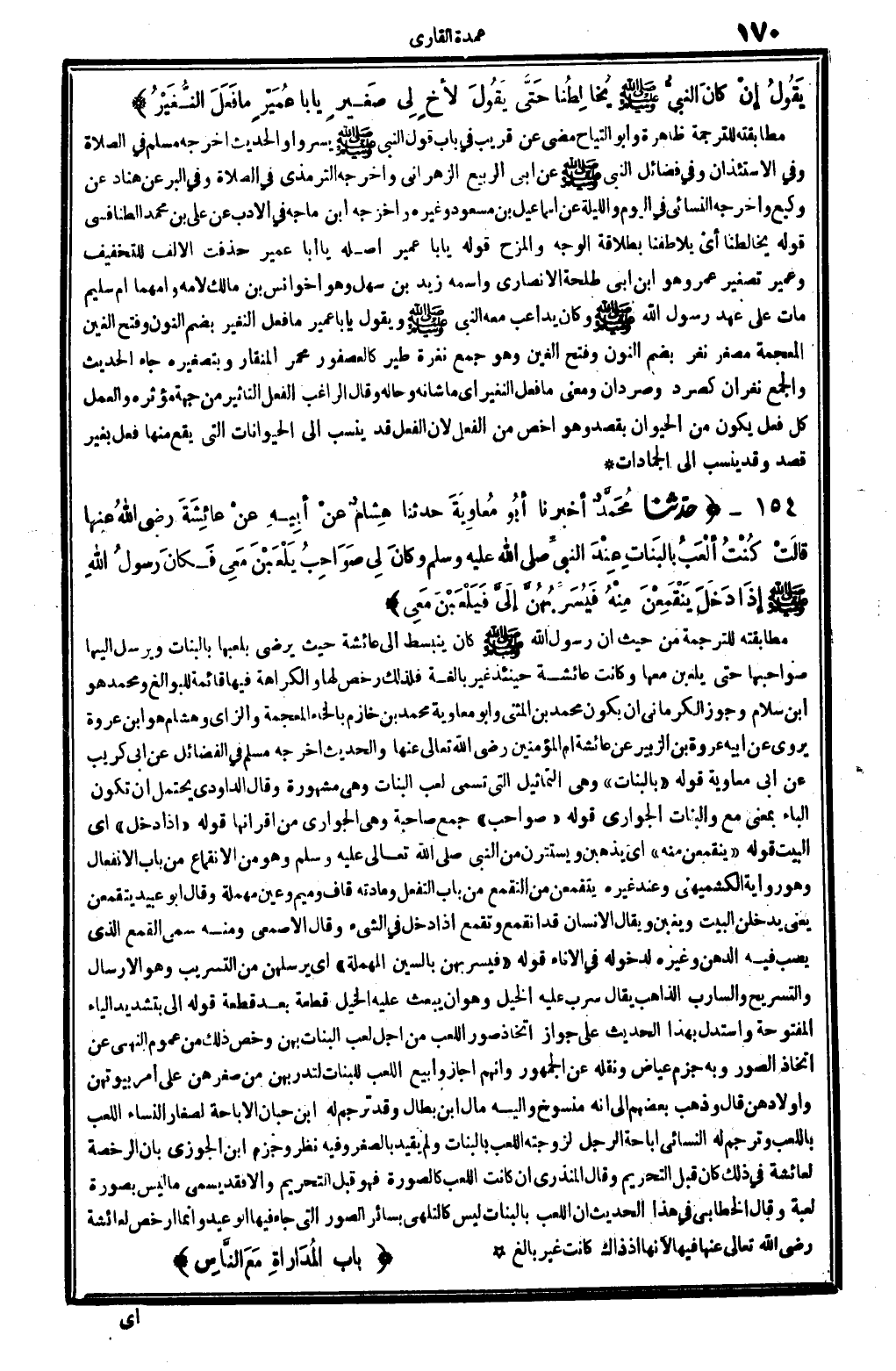 قَوْله: (بالبنات) ، وَهِي التماثيل الَّتِي تسمى لعب الْبَنَات، وَهِي مَشْهُورَة، وَقَالَ الدَّاودِيّ: يحْتَمل أَن يكون الْبَاء بِمَعْنى: مَعَ، وَالْبَنَات الْجَوَارِي. قَوْله: (صَوَاحِب) ، جمع صَاحِبَة وَهِي الْجَوَارِي من أقرانها. قَوْله: (إِذا دخل) ، أَي: الْبَيْت. قَوْله: (ينقمعن مِنْهُ) ، أَي: يذْهبن ويستترن من النَّبِي صلى الله عَلَيْهِ وَسلم، وَهُوَ من الانقماع من بَاب الانفعال وَهُوَ رِوَايَة الْكشميهني، وَعند غَيره: يتقمعن من التقمع من بَاب التفعل ومادته قَاف وَمِيم وَعين مُهْملَة، وَقَالَ أَبُو عبيد: يتقمعن يَعْنِي يدخلن الْبَيْت ويغبن، وَيُقَال: الْإِنْسَان قد انقمع وتقمع إِذا دخل فِي الشَّيْء، وَقَالَ الْأَصْمَعِي: وَمِنْه سمي القمع الَّذِي يصب فِيهِ الدّهن وَغَيره لدُخُوله فِي الْإِنَاء. قَوْله: (فيسرِّبهن) بِالسِّين الْمُهْملَة أَي: يرسلهن، من التسريب وَهُوَ الْإِرْسَال والتسريح، والسارب الذَّاهِب، يُقَال: سرب عَلَيْهِ الْخَيل وَهُوَ أَن يبْعَث عَلَيْهِ الْخَيل قِطْعَة بعد قِطْعَة. قَوْله: (إِلَيّ) بتَشْديد الْيَاء الْمَفْتُوحَة، وَاسْتدلَّ بِهَذَا الحَدِيث على جَوَاز اتِّخَاذ صور اللّعب من أجل لعب الْبَنَات بِهن، وَخص ذَلِك من عُمُوم النَّهْي عَن اتِّخَاذ الصُّور، وَبِه جزم عِيَاض وَنَقله عَن الْجُمْهُور، وَأَنَّهُمْ أَجَازُوا بيع اللّعب للبنات لتدربهن من صغرهن على أَمر بُيُوتهنَّ وأولادهن، قَالَ: ذهب بَعضهم إِلَى أَنه مَنْسُوخ وَإِلَيْهِ مَال ابْن بطال، وَقد ترْجم لَهُ ابْن حبَان: الْإِبَاحَة لصغار النِّسَاء اللّعب باللعب، وَترْجم لَهُ النَّسَائِيّ: إِبَاحَة الرجل لزوجته اللّعب بالبنات، وَلم يُقيد بالصغر وَفِيه نظر، وَجزم ابْن الْجَوْزِيّ بِأَن الرُّخْصَة لعَائِشَة فِي ذَلِك كَانَ قبل التَّحْرِيم، وَقَالَ الْمُنْذِرِيّ: إِن كَانَت اللّعب كالصورة فَهُوَ قبل التَّحْرِيم وإلاَّ فقد يُسمى مَا لَيْسَ بِصُورَة لعبة، وَقَالَ الْخطابِيّ، فِي هَذَا الحَدِيث: إِن اللّعب بالبنات لَيْسَ كالتلهي بِسَائِر الصُّور الَّتِي جَاءَ فِيهَا الْوَعيد، وَإِنَّمَا أرخص لعَائِشَة رَضِي الله عَنْهَا، فِيهَا لِأَنَّهَا إِذْ ذَاك كَانَت غير بَالغ.