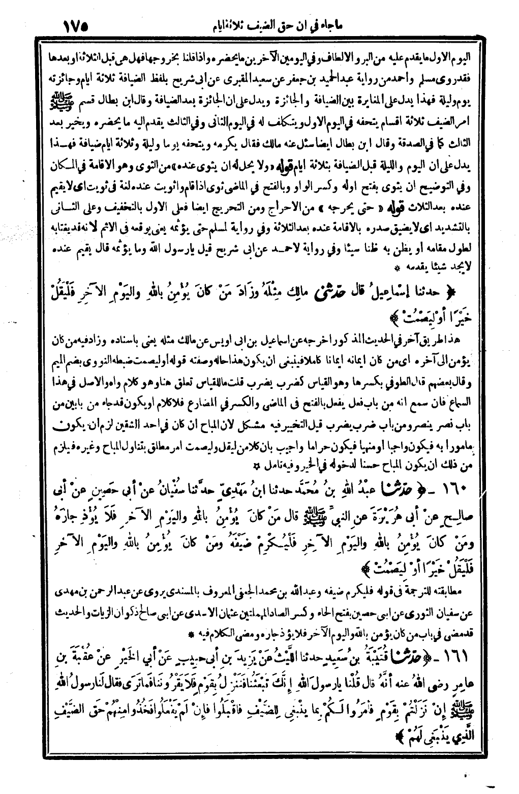 حَدثنَا إسْماعِيلُ قَالَ: حدّثني مالِك مِثْلَهُ، وزَادَ: مَنْ كانَ يُؤْمِنُ بِاللَّه واليَوْمِ الآخِرِ فَلْيَقُلْ خَيْراً أَوْ لِيَصْمُتْ.